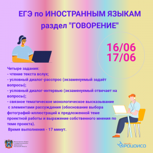 ЕГЭ по иностранному языку разделен на две части: письменную и устную (раздел «Говорение»), которые проводятся в разные дни. 13 июня участники ЕГЭ сдали письменную часть экзаменационной работы, для сдачи раздела «Говорение» предусмотрено два дня – 16 и 17 июня. Устная часть включает в себя 4 задания (три задания базового уровня сложности и 1 задание высокого уровня), продолжительность выполнения участником всех заданий составляет 17 минут.