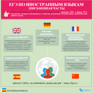 ЕГЭ по иностранным языкам сдают 2024 участника, 98% из них выбрали английский язык. Экзаменационная работа по английскому, французскому, немецкому и испанскому языкам состоит из четырёх разделов, включающих в себя 40 заданий, по китайскому языку – 29 заданий. На выполнение экзаменационной работы отводится 3 часа (180 минут). Установленный минимальный балл на ЕГЭ по иностранным языкам составляет 22 балла.