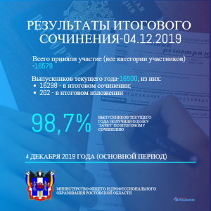 16 декабря стали известны результаты итогового сочинения (изложения), которое проводилось 4 декабря. Из 16,5 тысяч выпускников текущего года Ростовской области участники итогового сочинения (98,7%), участники изложения (100%) получили зачет и допуск к государственной итоговой аттестации.