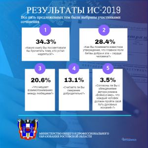 Анализ выбора участниками тем итогового сочинения показал, что все пять предложенных тем были выбраны участниками сочинения. Из 16377 участников итогового сочинения наибольшее количество участников выбрали тему «Какую книгу Вы посоветовали бы прочитать тому, кто устал надеяться?» – 5615 чел. (34,3 %). Тему «Как Вы понимаете известное утверждение, что главное поле битвы добра и зла – сердце человека?» выбрали 4655 чел. (28,4 %); тему «Что мешает взаимопониманию между любящими?» – 3377 чел. (20,6 %); тему «Считаете ли Вы смирение добродетелью?» – 2153 чел. (13,1 %); тему «Согласны ли Вы с убеждениями автора романа «Война и мир», что каждый человек должен пройти свой путь духовных исканий»?» – 577 чел. (3,5 %).