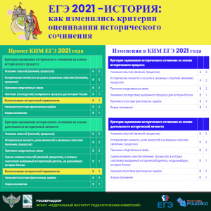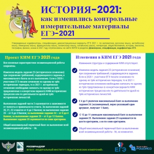 Обзор изменений КИМ ЕГЭ 2021 года по истории представлен в формате инфографики. Утвержденные КИМ ЕГЭ 2021 года опубликованы на сайте ФИПИ в разделах Демоверсии, спецификации, кодификаторы ЕГЭ.