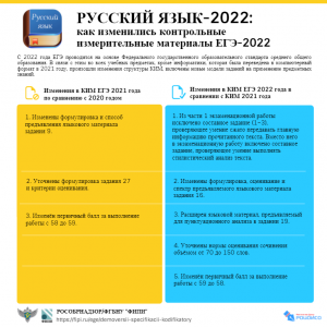 Также в ЕГЭ-2022 изменили формулирование, оценивание и спектр предъявляемого языкового материала в задании №16, расширили языковой материал для пунктуационного разбора в задании №19, уточнили нормы оценивания сочинения объемом от 70 до 150 слов и изменили первичный балл с 59-ти до 58-ми.
