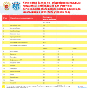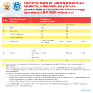 Количество баллов по общеобразовательным предметам, необходимое для участия в региональном этапе всероссийской олимпиады школьников в 2019/2020 учебном году смотрите в нашей инфографике. Вся оперативная информация о подготовке и проведении регионального этапа ВсОШ размещается на сайте rcoi61.ru. Необходимо следить за обновлениями.