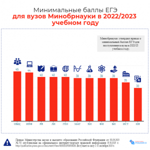 Наглядно минимальные баллы ЕГЭ на 2022/2023 учебный год для образовательных организаций, находящихся в ведении Минобрнауки России представлены в нашей инфографике.