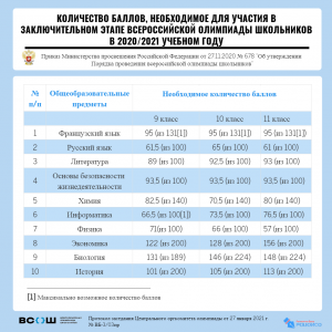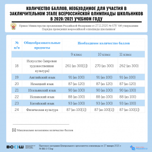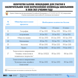 Информация о количестве баллов, необходимых для участия в заключительном этапе ВсОШ в 2020/21 учебном году, по 24-м общеобразовательным предметам представлена в формате инфографики.
