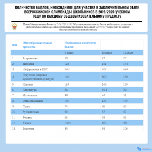 Особенности проведения ВсОШ в 2019/20 учебном году и утверждения ее итоговых результатов по каждому общеобразовательному предмету, количество баллов по каждому общеобразовательному предмету и классу, необходимое для участия в заключительном этапе всероссийской олимпиады школьников в 2019/20 учебном году представлены в формате инфографики.
