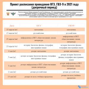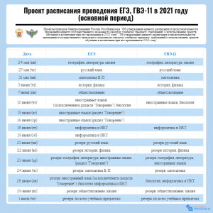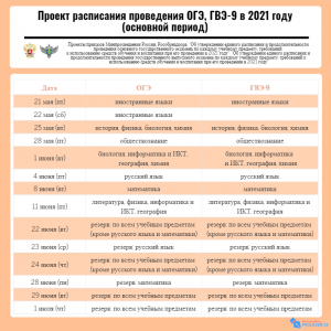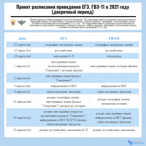 Заявления на участие в ЕГЭ и ГВЭ-11 принимаются до 1 февраля 2021 года, на участие в ОГЭ и ГВЭ-9 – до 1 марта 2021 года. Проекты расписаний проведения ЕГЭ, ГВЭ-11, ОГЭ, ГВЭ-9 смотрите в формате инфографики.