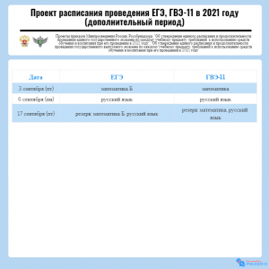 Опубликованы проекты расписаний ЕГЭ, ОГЭ и ГВЭ на 2021 год для общественного обсуждения. В соответствии с проектом расписания ЕГЭ, планируется, что в 2021 году экзамены традиционно пройдут в три этапа: досрочный (с 22 марта по 16 апреля), основной (с 24 мая по 1 июля) и дополнительный (с 3 по 17 сентября).