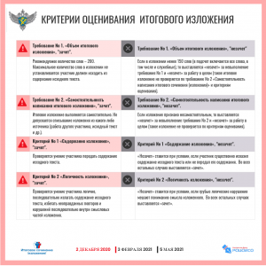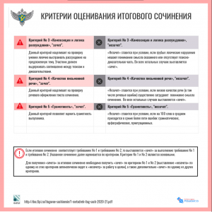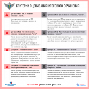 Самое главное – перед итоговым сочинением (изложением) выпускники должны быть знакомы с Памяткой о порядке проведения итогового сочинения (изложения), с инструкцией для участника итогового сочинения (изложения) и критериями оценивания (Приложения 1, 2, 6, 10 к письму Рособрнадзора от 24.09.2020 № 05-86).