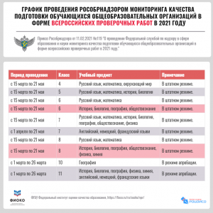 Приказом Рособрнадзора от 11.02.2021 № 119 утвержден график проведения ВПР в 2021 году.
