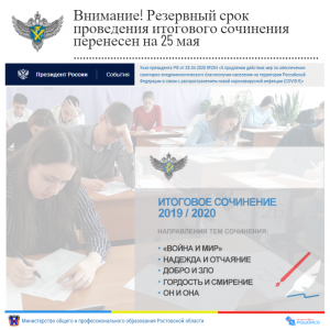 Если эпидемиологическая ситуация и принятые в отдельных регионах ограничительные меры не позволят провести итоговое сочинение 25 мая, Рособрнадзор определит для этих регионов новую дату.