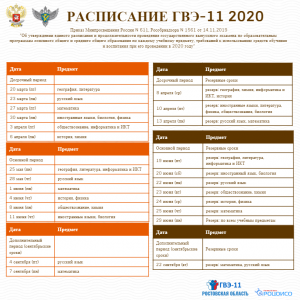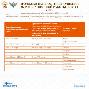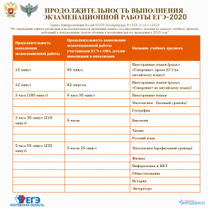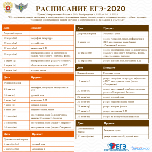 Приказами Рособрнадзора и Минпросвещения России утверждены расписания ЕГЭ и ГВЭ-11 в 2020 году. Этими же приказами определены продолжительность проведения экзаменов и перечень дополнительных средств обучения, которые можно иметь при себе на экзаменах по различным предметам.