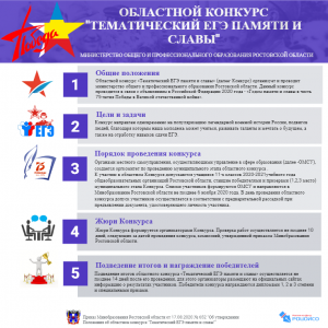 В соответствии с приказом минобразования Ростовской области от 17.08.2020 № 652 «Об утверждении Положения об областном конкурсе «Тематический ЕГЭ памяти и славы» в ноябре месяце текущего года пройдет областной конкурс «Тематический ЕГЭ памяти и славы» (далее - Конкурс) в рамках объявления в Российской Федерации 2020 года – «Годом памяти и славы в честь 75-летия Победы в Великой отечественной войне».