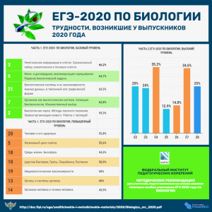 Посмотреть, какие задания выполнены выпускниками 2020 года по биологии наименее успешно, можно в нашей инфографике, более подробную информацию об итогах анализа результатов ЕГЭ -2020 по биологии - на сайте ФИПИ.