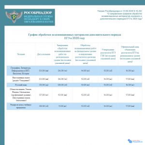 Федеральная служба по надзору в сфере образования и науки письмом от 23.06.2020 N 10-262 информировала о графиках обработки экзаменационных материалов основного и дополнительного периодов ЕГЭ в 2020 году.