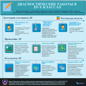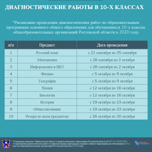 В период с 21 сентября по 30 октября текущего года в образовательных организациях, расположенных на территории Ростовской области, будут проводиться диагностические работы (ДР) для обучающихся 10-х классов согласно расписанию проведения ДР, утвержденному приказом минобразования Ростовской области от 19.08.2020 № 657.