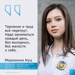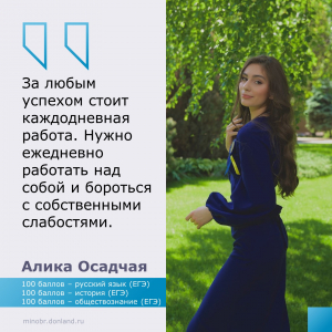 «За любым успехом стоит каждодневная работа, поэтому тем, кто стремится достичь высоких результатов на ЕГЭ, нужно понимать, что не раз придётся отказаться от прогулки с друзьями или вечернего просмотра фильма и вместо этого выучить определения по обществознанию или даты по истории. Но только таким образом, ежедневно работая над собой и борясь с собственными слабостями, можно быть уверенным, что приложенные усилия дадут свои плоды и все старания окупятся с лихвой», - рассказала донская выпускница Осадчая Алика.