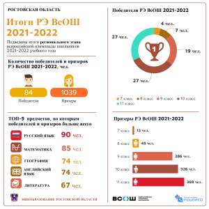 Какие топ-предметы по числу участников, какое количество призеров и победителей РЭ ВсОШ в 2022 году в Ростовской области-смотри в нашей инфографике.