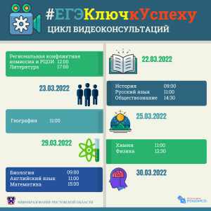 Минобразование Ростовской области совместно с ГБУ РО «Ростовский областной центр обработки информации в сфере образования» (РОЦОИСО) запустили цикл видеоконсультаций «ЕГЭ-ключ к успеху!» для будущих участников экзаменов и преподавателей школ.
