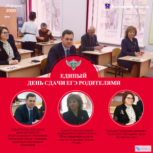 28 февраля эстафету приняли школы г. Ростова-на-Дону. В пункте проведения экзамена, расположенном в школе № 80, вместе с родителями ЕГЭ писали заместитель министра общего и профессионального образования Ростовской области - начальник управления непрерывного образования Андрей Фатеев, депутат Государственной Думы VII созыва Лариса Тутова, а также особенный гость - председатель комитета ветеранов войны и Вооруженных сил совета ветеранов г. Ростова-на-Дону Тамерлан Камбегов.