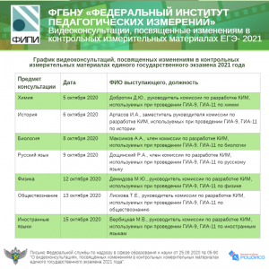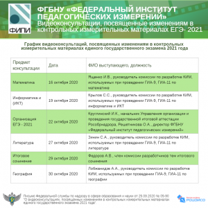 Рособрнадзор совместно с ФГБНУ «ФИПИ» в октябре 2020 года будет проводить видеоконсультации, посвященные изменениям в контрольных измерительных материалах единого государственного экзамена 2021 года. Онлайн-консультации состоятся по всем предметам ЕГЭ и будут полезны ученикам и учителям выпускных классов.