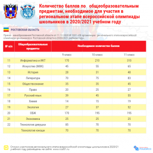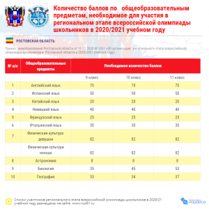 Количество баллов по общеобразовательным предметам, необходимое для участия в региональном этапе всероссийской олимпиады школьников в 2020/2021 учебном году, смотрите в нашей инфографике.