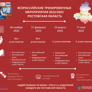 В 2022-23 уч.г. Всероссийские тренировочные мероприятия пройдут 30.11.2022, 17.02.2023, 10.03.2023 и 17.05.2023 гг. Ростовская область примет участие во всех мероприятиях, в ходе которых будет задействовано не менее одного ППЭ каждого муниципалитета региона для проверки готовности техники и отработки технологии передачи экзаменационных материалов по сети «Интернет» и сканирования ЭМ в штабе.