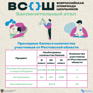 Заключительный этап ВсОШ в текущем учебном году проходит с 14 марта по 3 мая. На данный момент определены проходные баллы по 23 предметам. Проходные баллы по предметам и количество участников от Ростовской области – в нашей инфографике.