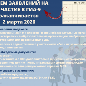 Прием заявлений от обучающихся 9-х классов на участие в государственной итоговой аттестации по образовательным программам основного общего образования (далее – ГИА) в этом году завершается 2 марта, т.к. 1 марта выпадает на выходной день.
