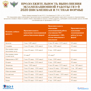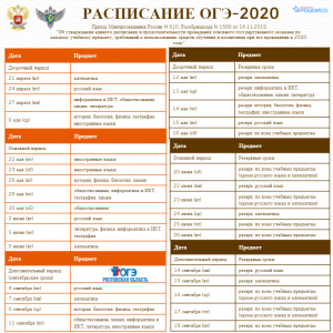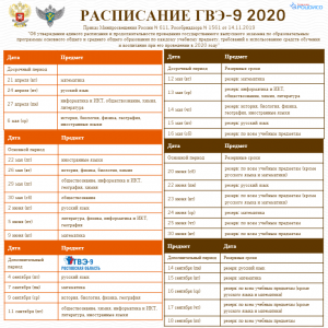 Приказами Рособрнадзора и Минпросвещения России утверждены расписания ОГЭ и ГВЭ-9 в 2020 году. Этими же приказами определены продолжительность проведения экзаменов и перечень дополнительных средств обучения, которые можно иметь при себе на экзаменах по различным предметам.