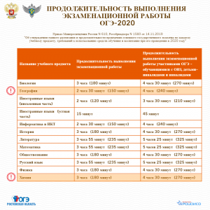 ОГЭ и ГВЭ-9 по всем учебным предметам начинается в 10.00 по местному времени. Увеличилась продолжительность выполнения ОГЭ по химии до 3 часов в связи с обязательным выполнением лабораторной работы, ОГЭ по географии - до 2 часов 30 минут.