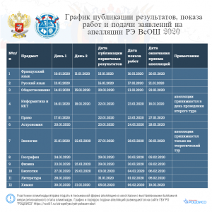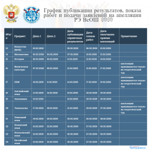 График публикации результатов, показа работ и подачи заявлений на апелляции РЭ ВсОШ 2020 смотри в нашей инфографике, более подробную информацию об апелляциях, показе работ-на сайте ГБУ РО «РОЦОИСО» https://www.rcoi61.ru/.